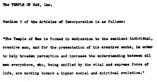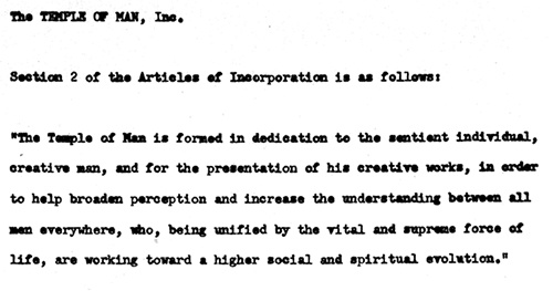 As he later indicated in a memo to his ministry, it was surely also the work of Wallace Berman that initially inspired and led Alexander to the idea of the Temple of Man. Berman’s contentious 1957 show at Ferus (which ultimately led to his arrest by the LAPD) included a piece called Temple, a shack-like structure, the walls of which were painted black. Inside a figure stood with its back to the viewer, wearing a long white robe and an oversized key that hangs from the neck. Pages of Semina were scattered on the floorboards. The ambiguous scene, which seems to depict a type of personal sacredness and to connect religious imagery to creative output, is reflected in another tenet often used by Alexander and printed on Temple of Man material: “The Temple of Man is within.” Originally coined by Meltzer, the sentiment is reiterated in the Temple’s articles of incorporation, dated 1967: “The Temple of Man is formed in dedication to the sentient individual, creative man, and for the preservation of his creative works, in order to help broaden perception and increase the understanding between all men everywhere, who, being unified by the supreme force of life, are working toward a higher social and spiritual evolution.”10