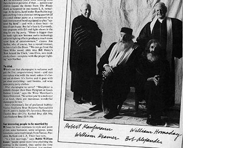 Call it a sign of the times: In July 1979, as American divorce rates were peaking, Los Angeles magazine ran a tongue-in-cheek article about second (or third or fourth) weddings; a section of it, “Four Interesting People to Be Married By,” featured a picture of the Reverend Robert Alexander. He sits on a bench against a cloth backdrop, alongside a rabbi, a self-help writer, and a noted minister to a congregation of 10,000. His hands are folded together, and he wears a long black robe, with a full beard and bushy gray hair, a small crease in his brow, and a pensive expression of a slightly comic bent; “Groucho Marx as village priest,” as he was described by his friend, artist George Herms. The brief caption farther down the page reads,