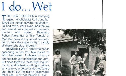 Robert Alexander (right) officiating a hot tub wedding ceremony in Venice, 1978. Photo: Lyle Mayer.