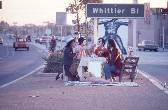 This performance by the art collective Asco took place on the same street that violent rioting between Chicano anti-war protestors and the police had taken place. Pictured: Patssi Valdez, Humberto Sandoval, Willie Herron III and Gronk. Photo: Harry Gamboa, Jr. Courtesy the artists.