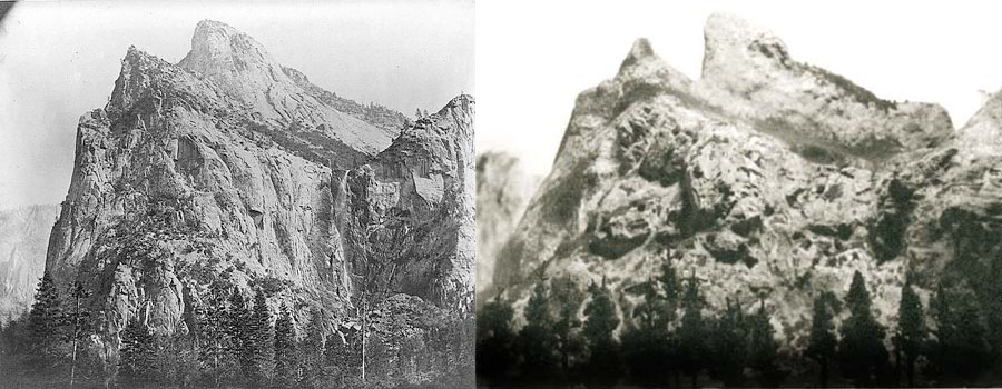 Left: Carleton Watkins, Bridalveil Fall from Cathedral Trail, Yosemite National Park, Calif., 1860, Library of Congress