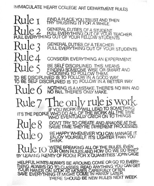 Rules for the art department at the Immaculate Heart College in Los Angeles, developed by Sister Mary Corita Kent.