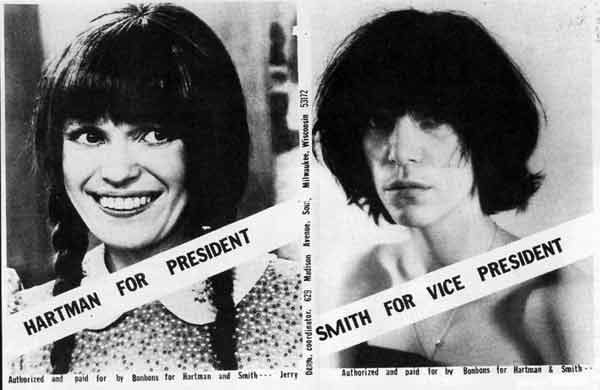 “Dreva livens up the most boring presidential election in memory with two flyers promoting the candidacy of Mary Hartman for president and Patti Smith for vice-president of the United States. Smith accepts nomination as “president of vice” during Milwaukee concert. Edition 1500″ Source: Suzan Carson, “Have You Heard From Dreva?” High Performance vol. 2, no. 2 (1984), p. 17-30.