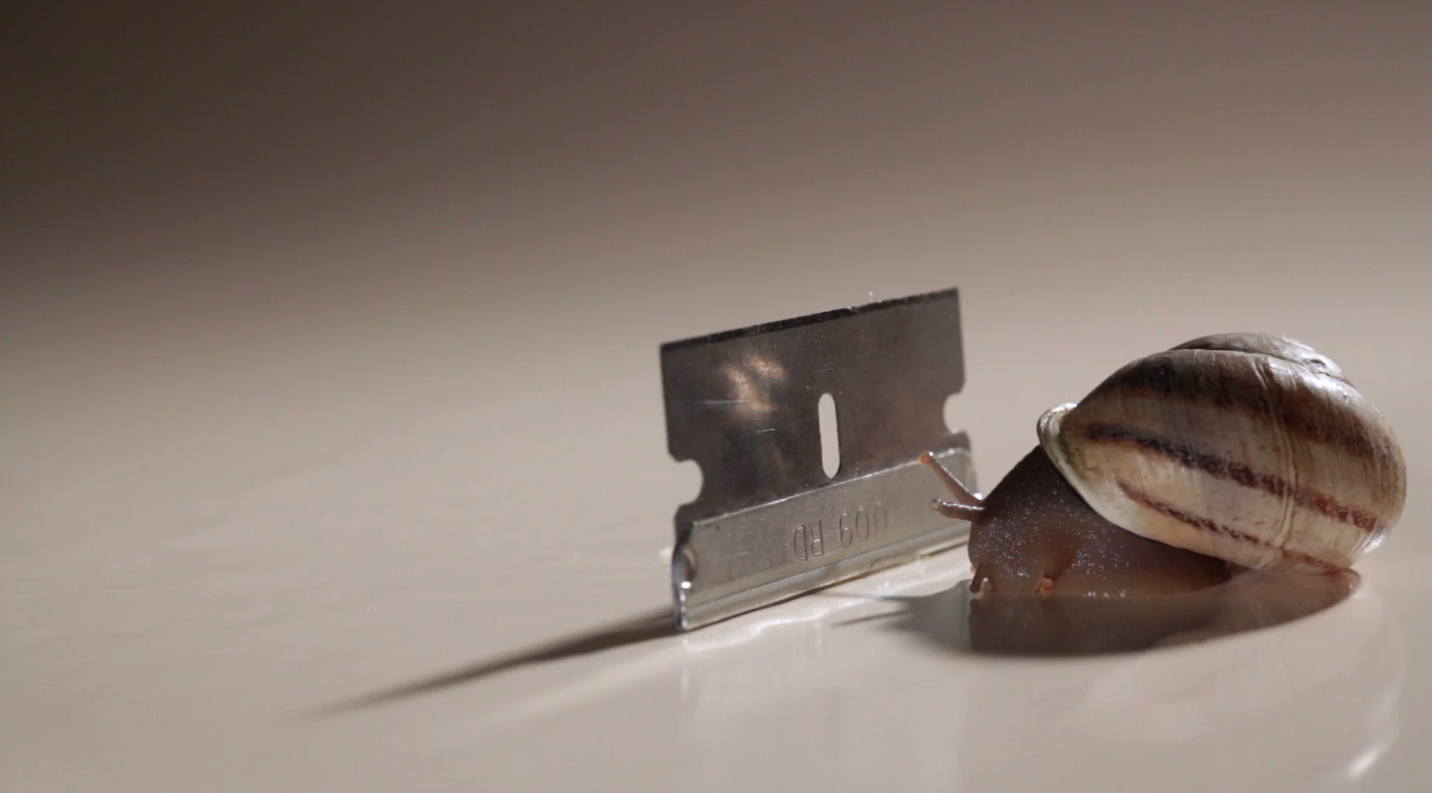 The Snail and the Razor depicts an interaction between a snail and an erect razor blade. Watching the video in real time is at once suspenseful, agonizing, humorous, heroic, suicidal, and inevitably transcendent. The action starts small, growing as we reflect on, and identify with, the journey of the slow moving creature.