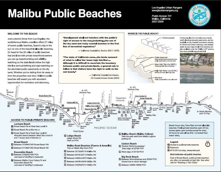 According to their website, “The Los Angeles Urban Rangers develop guided hikes, campfire talks, field kits, and other interpretive tools to spark creative explorations of everyday habitats, in our home megalopolis and beyond.” Their indispensable guide to the public beaches of Malibu details your legal right to access the 20 miles of scenic public beach that are lined with private development and often protected by security guards, parking barriers, intimidating signs and other obstructions. Nonetheless, the lands are protected by the California Coastal Act and meant to be enjoyed. Use this guide to find public access points, safety tips, parking information and more.