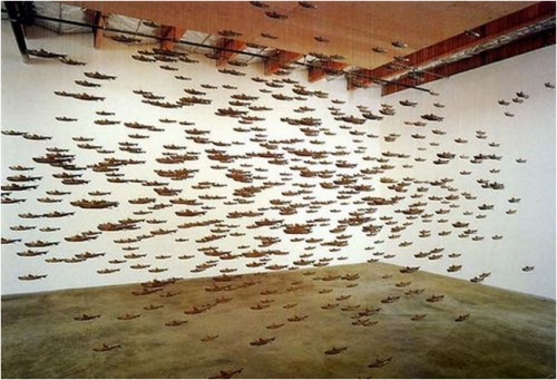 By 1976, Burden’s preoccupation with television art was in full swing. The most literal situation he staged to test television as metaphor for belief was on February 26 at the Alberta College of Art in Calgary. Prior to the performance Do You Believe in Television, Burden scattered a trail of hay that began in the basement of the building and continued up three flights of stairs. Large TV monitors were mounted on the landings of each floor where those in attendance were expected to gather. The monitors showed a video image of a black cross on the floor, made with what appeared to be paint. The cross, visible nowhere in the space except on the monitors, was surrounded with hay, the only reference to the hay the spectators would have been walking on during the anxious moments when nobody knew exactly what would happen. Suddenly a loud voice emanating from the monitors asked, “Do you believe in television?” and the video screens showed a hand lighting the hay with a match. A flame then shot up from the basement riding the path of hay toward the audience on the stairs above. The live fire made it somewhere near the building’s second level before the spectators—understanding that complicity could equal disaster—pounced on the flame to extinguish it.