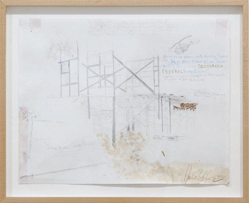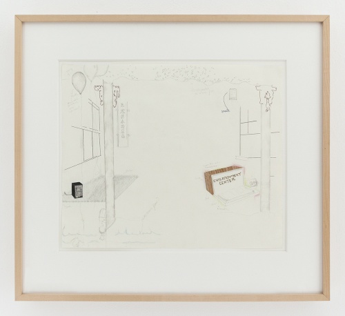 These in-between spaces—not quite occupied or abandoned, not domestic or commercial—emerge from a city where transience is not just a state of living, but a state of development. L.A.’s gas stations, parking lots, and retail complexes typify a city (and post-industrial America as a whole) made up of spaces meant to be passed through. Becker’s own Echo Park neighborhood, as described by Mark Von Schlegell in Mousse, was “mostly taken up by gas stations […] and flimsy, low-income rental units,” following years of decline in the area.19This landscape has drastically changed over the last decade with the rapid gentrification of Echo Park and its neighboring areas in and around east L.A.20Back in the ‘90s, Becker lived illegally in a storefront studio designated as a commercial space, with the towering presence of the California Federal Bank building—now Citibank—overhead.21 In areas such as these, commercial and industrial development cross-pollinates with residential tenancy. Further inflamed by California’s culture of NIMBYism, unsightly developments are blocked from wealthier residential areas and pushed instead into areas of low income housing among the commercial complexes and freeways. In a 2011 Eastsider article, the ominous presence of CalFed—its building noticeably the only hi-rise in the neighborhood—was speculatively posed as the reason that many Echo Park residents may be scared of heights; speculation aside, its height disturbed the surrounding residential space.22 The bank also began seeping into Becker’s practice. In drawings such as Untitled (Whole Series) (2003), where the words “Top Floor in CalFed (Or Part of It) is Top Floor of House” are scrawled above a table and window setup, it is as if the uncertain limits of Becker’s home overlapped with the boundaries of the bank itself. Additionally, in 1910 West Sunset Blvd (2000) Becker reproduced a section of the pavement outside the bank building, complete with a manhole cover and street graffiti, where a discarded floral slipper highlights the proximity to home.