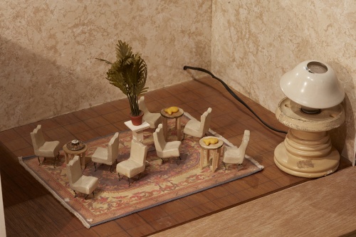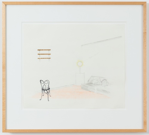 An understanding of the transitory experience of occupying private space is evident through each of the three rooms of Researchers. The ‘waiting room,’ which features a desk and name plate, a green banker’s lamp, a glowing blue fish tank, and a closed dossier file, also has a series of alternative name plates on a square of red carpet beside the desk: ‘Real Estate Agent,’ ‘Psychiatrist,’ ‘Entertainment Agency,’ ‘Concierge.’ The room exists as each of these sites and none of them, establishing a work which from the beginning is bubbling with liminality and spatial in-between. Behind the desk hangs an unlabelled set of floor plans, seemingly referring indirectly to the miniature models that follow. A two-seater leather sofa, a cabinet with a copy of Vogue, a Stephen King special T.V. guide, and a used ashtray cast the room as a doctor’s reception area, a hotel lobby, or a travel agency. It seems to be priming us for something more permanent beyond which Becker does not satisfy, with further versions of semi-inhabited transitory space in the next room. Becker mimics these types of spaces in her drawings, some of which were presented with Researchers in the retrospective I must create a Master Piece to pay the Rent. Entertainment Center (1996-7) is an almost empty page filled with floating objects: a small wooden building, a pair of shaded columns, some half-finished window-like shapes, balloons, a speaker.17 Mysterious Round Object and Incomplete Chair (1996-7), with its strange high shelves, singular chair, faded sofa, and glowing yellow orb in the corner of the room recalls the energy of the waiting room.18