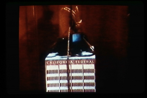 Growing up in and around Los Angeles, Becker spent much of her childhood moving between a series of low-rent apartments with her artist parents. It is possible that some of these residences were Single Room Occupancy hotels (SROs), a type of affordable housing with a long history in many American cities.5Fueled by years of city planners’ and politicians’ attempts to cast their low-income residents as dangerous, and exacerbated in popular culture by 1930s detective novels set in Bunker Hill and the infamous and ongoing stories of the Cecil Hotel, these hotels soon became associated with fear in the city’s public imagination.6Whilst Becker’s lived experience in SROs is speculative, hotel-like interiors creep into Researchers, nodding to this type of transient housing which had also become shorthand, through a nationwide myth-building, for spaces seen as haunted or unsafe.7Becker’s struggles with stable housing continued into her adult life with many years spent in an Echo Park home owned by the California Federal Bank whose building loomed above it, a home which Chris Kraus described as “a shack falling into the ground.”8The space was originally intended for Becker’s studio, but it became slowly apparent that this would also be her long-term abode. After the occupant living in the basement apartment had died of AIDS, the bank allowed Becker to utilize the space for free in exchange for clearing out his belongings.9Instead, she cut a hole in the floor of her own living room-studio above and recorded herself lowering a model of the CalFed bank into the basement, a work which would expand amorphously into the unfinished project, Whole. Whilst in Researchers the role of Becker’s own lived circumstances remains uncertain, in Whole her home undeniably merges with the work. This dramatic collapse of boundaries reveals a pliability to the space which surrounded Becker and fed into her practice, an ability to move from fiction to reality without being detected, to occupy both realms at once.