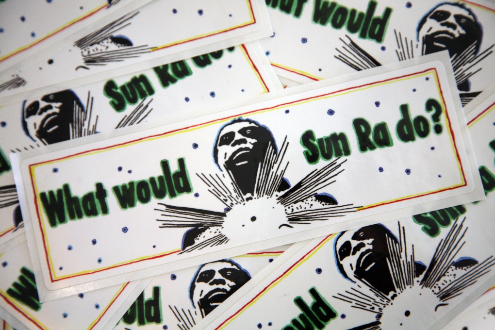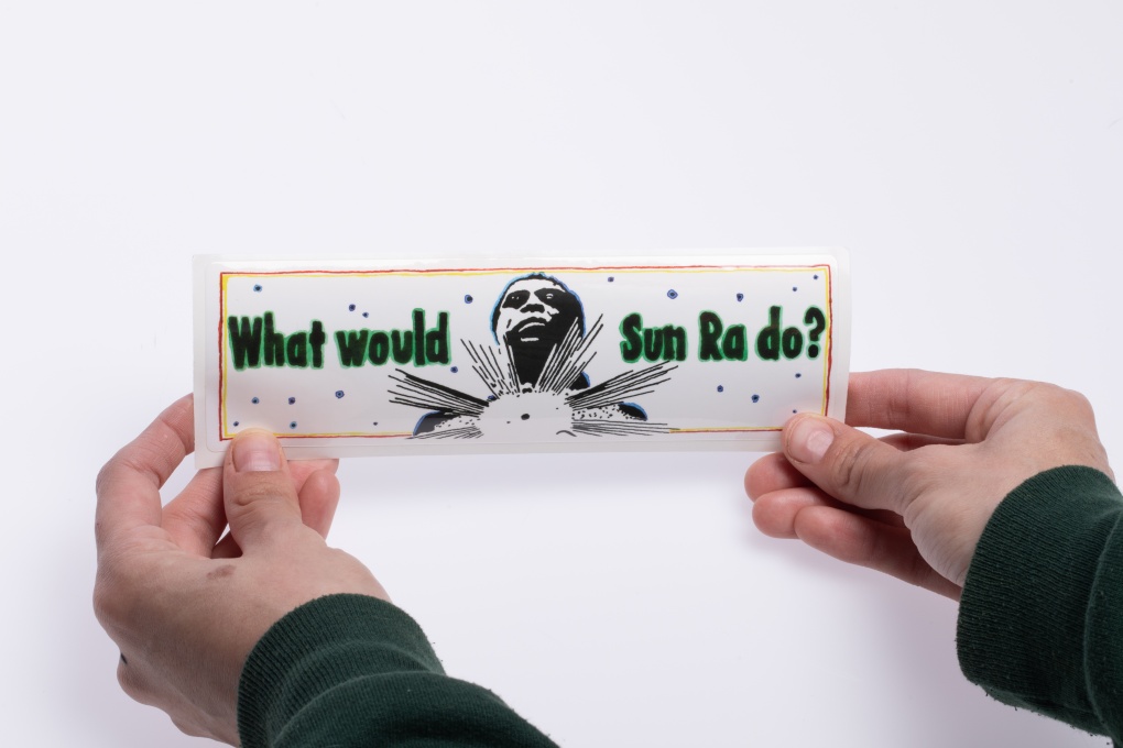 A mini version of our limited edition by Dave Muller, this sticker is 2 x 7 in. Referencing the evangelical prompt “WWJD?,” it depicts Sun Ra—the prolific jazz composer and father of Afrofuturism—floating among blue stars with an emanating sun in place of his heart.