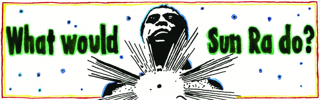 A mini version of our limited edition by Dave Muller, this sticker is 2 x 7 in. Referencing the evangelical prompt “WWJD?,” it depicts Sun Ra—the prolific jazz composer and father of Afrofuturism—floating among blue stars with an emanating sun in place of his heart.